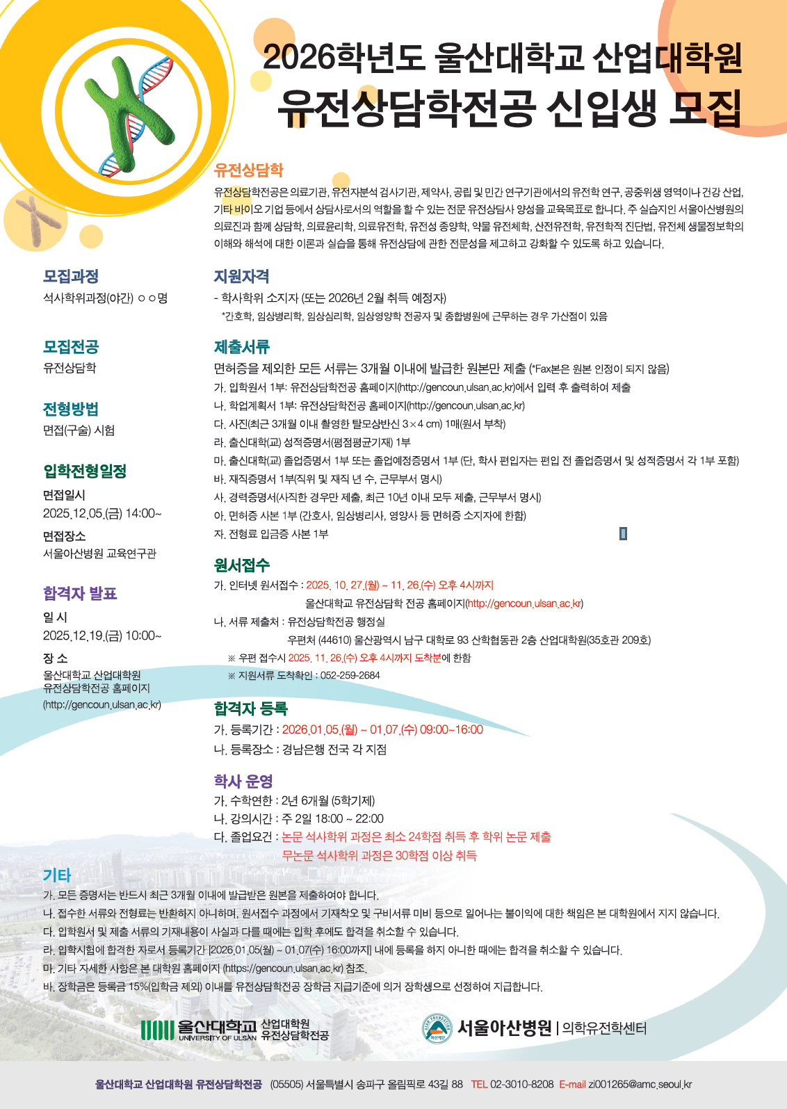 제목 : 2026학년도 울산대학교 산업대학원 유전상담학 신입생 모집 안내